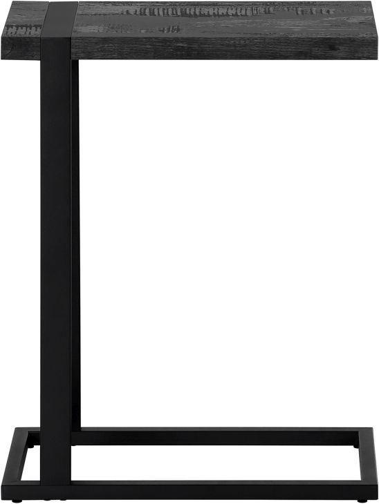 Industrial-farmhouse style combines modern metal with a rustic wood finish to create a warm, inviting look. This C-shaped accent table embodies that popular style. The tabletop is finished in a black reclaimed-wood look with naturalistic color variations and a subtle wood-grain texture. The robust metal frame in a black finish is incorporated into the thick tabletop for a striking visual contrast and to provide stability. Lightweight and finished on all sides, this C table can be slid under a sofa or chair in a living room or used as a side table in a bedroom.
