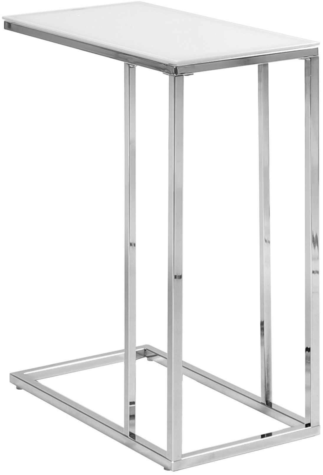 A perfectly tapered contemporary rectangular accent table that fits independently with any furniture in your home; features a chic white frosted 5mm thick tempered glass surface perfect for your tablet, snacks, drinks or even meals. The stylish chrome metal base provides sturdy support along with a fashionable touch. This practical and functional snack table is a must-have for your home or office.