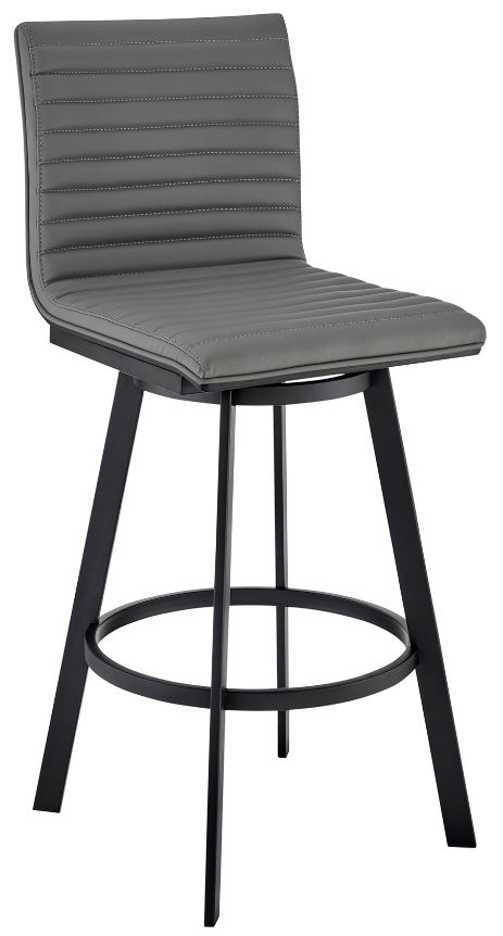 The foam-padded seat and back cushion of this Jermaine Swivel Bar Stool offers you the most comfort available to you! The Jermaine also features a brushed wood veneer back and convenient metal footrest, for additional support and stability. The Jermaine comes in a variety of color and finishes; gray faux leather with black metal or brushed stainless steel finishes and black brushed wood back, or walnut finished back. All color options are available in your choice of 26" counter height and 30" bar height.