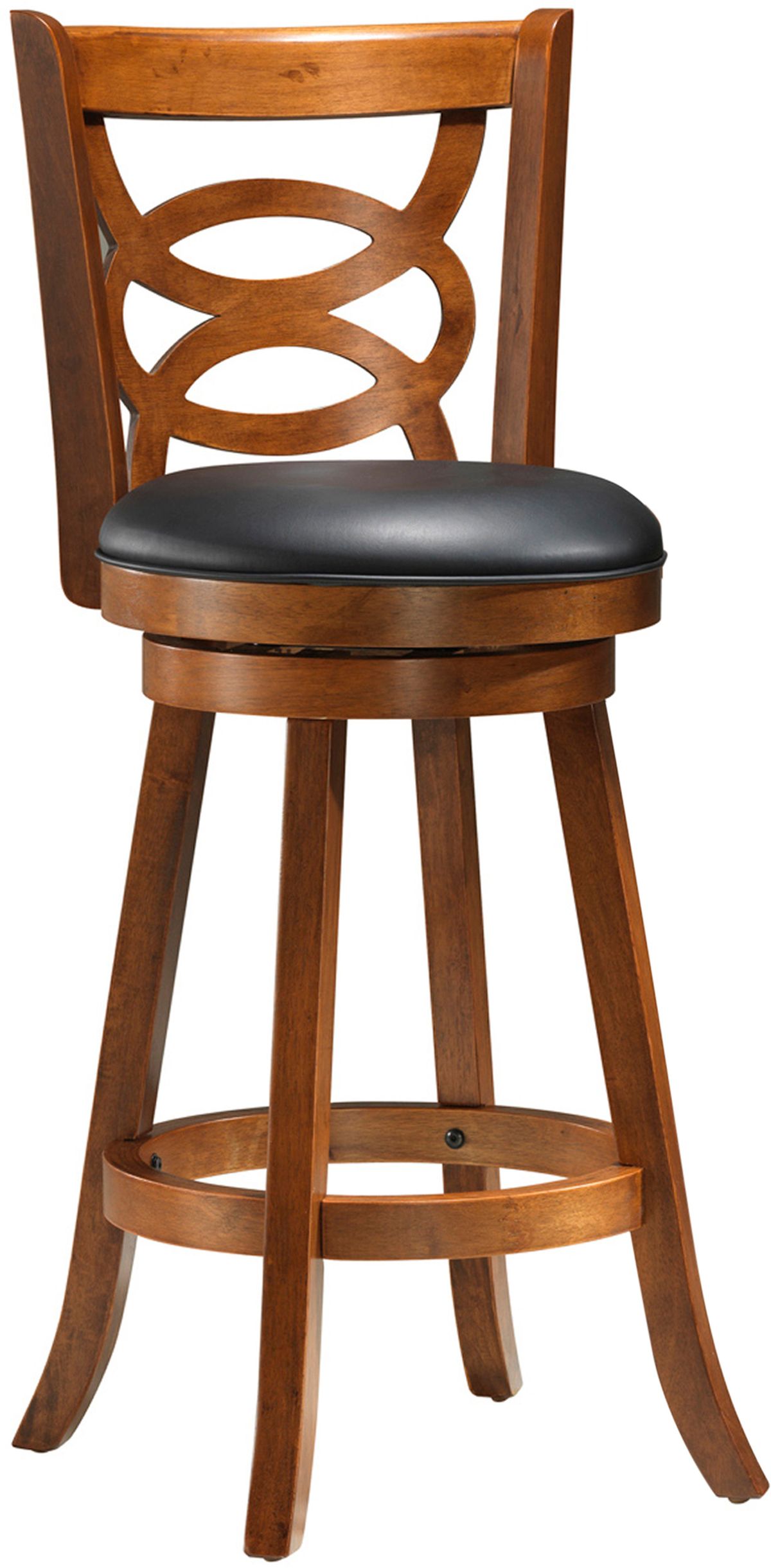 Style or comfort? Why pick when this set of 2 dark oak finish wood bar stools blends both so seamlessly. With plush black leather-look 360 degrees swivel seats, interlocking circle design and perfectly positioned circular footrest, these bar height bar stools will add a touch of elegance to any game room or dining area.