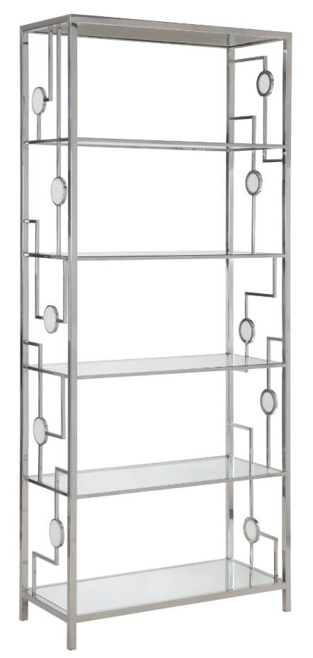 The artistic design of the Alba etagere plays with geometric shapes and angles. The open polished stainless steel frame features circles of white onyx stone on both sides. Glass shelves contribute to the elegant and airy look.Read More