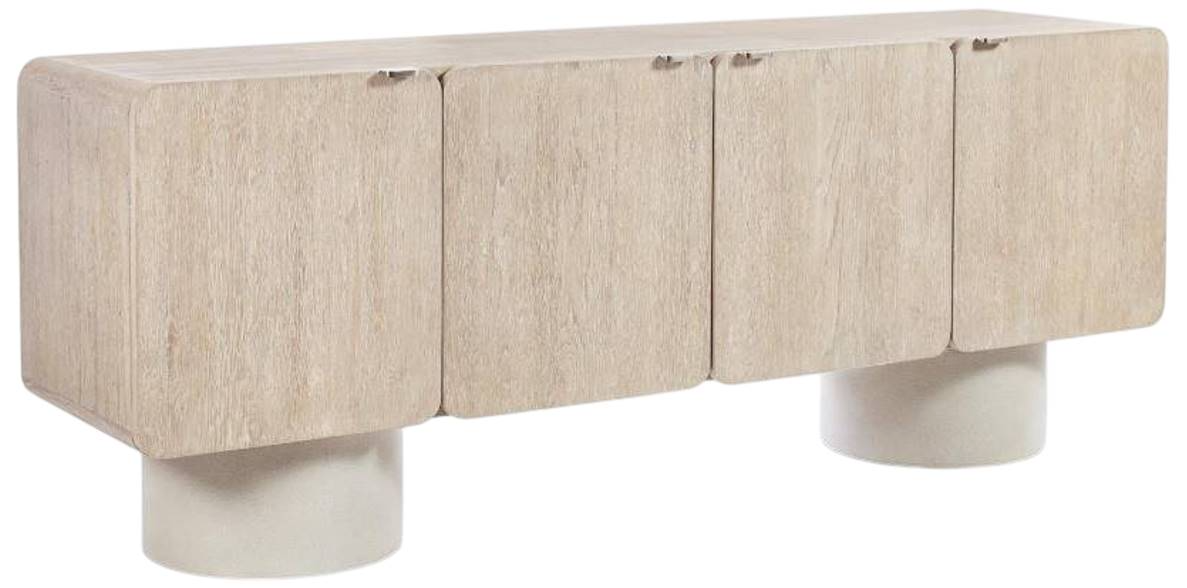 The Antibes entertainment credenza takes an elemental approach to modern organic design. Two round pedestals are deeply textured in glass-reinforced concrete. They support the wooden case in a light Roz finish, with four pull-to-open doors that have cast aluminum tab pulls. Interior storage includes three adjustable shelves.Read More