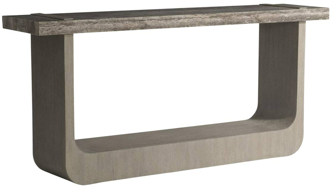 The wood sides of the Azzura console table flow into a rounded base and form a lower shelf. The side panels pierce the stone top, offering a unique style for this modern organic design.Read More