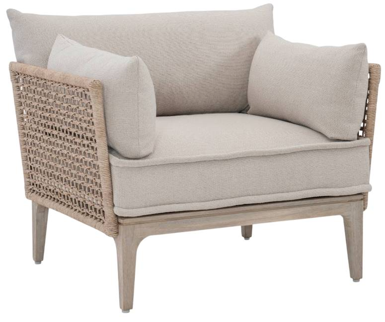 In a mix of stunning textures, the Catalonia chair is designed with twisted abaca all-weather wicker across the sides and back, over a frame of sun-washed teak. A deep seat cushion is flanked by a back pillow and two bolsters for ease and comfort.Read More