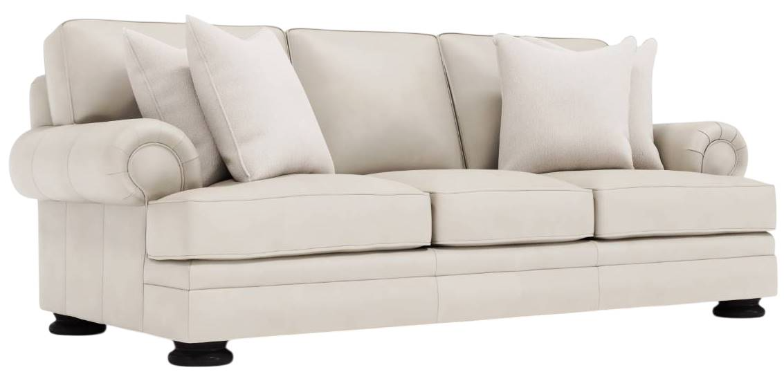 The stately Foster leather sofa offers comfortable support with an air of traditional grandeur. The plush cushions invite relaxation, while rolled arms, welt trim, and wide bun feet exude refinement. Throw pillows complement the sofa and surrounding decor.Read More
