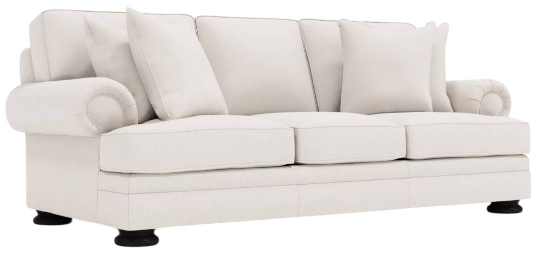 The stately Foster sofa offers comfortable support with an air of traditional grandeur. The plush cushions invite relaxation, while rolled arms, welt trim, and wide bun feet exude refinement. Throw pillows complement the sofa and surrounding decor.Read More