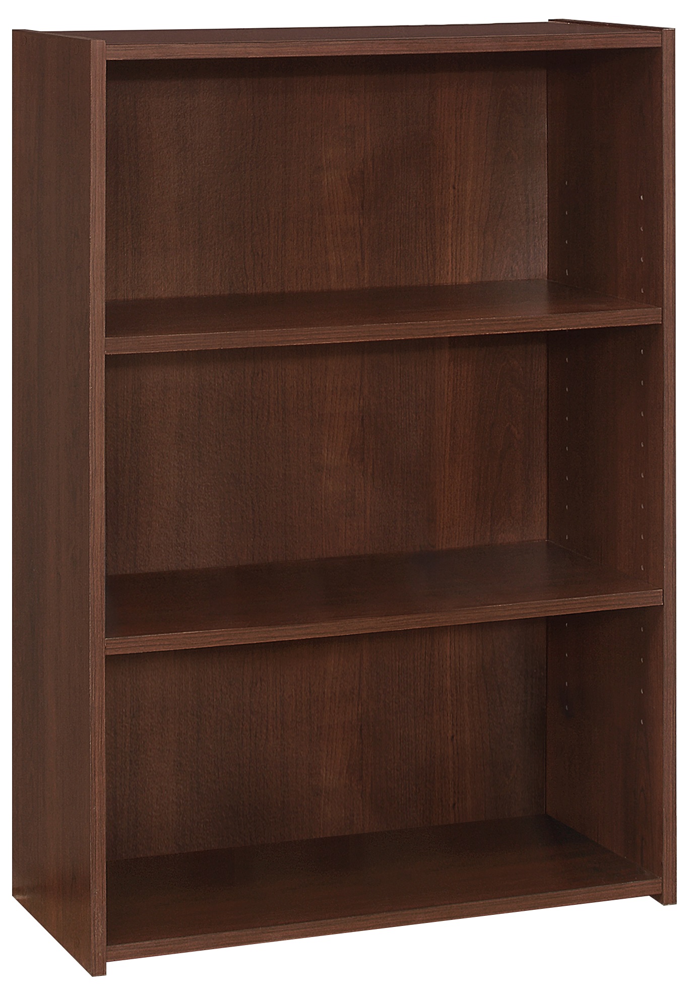 This 3-shelf bookcase in a simple, clean and space-saving design makes it a versatile storage option for any room in your home. The solid adjustable shelving allows for various sized objects to be displayed in your own creative way. Constructed from engineered materials in a sophisticated cherry laminate finish, this transitional style bookcase could be used in an entryway to store all your shoes, or in a living room, home office, or bedroom to place books, toys, and decorative objects. Assembly is required.