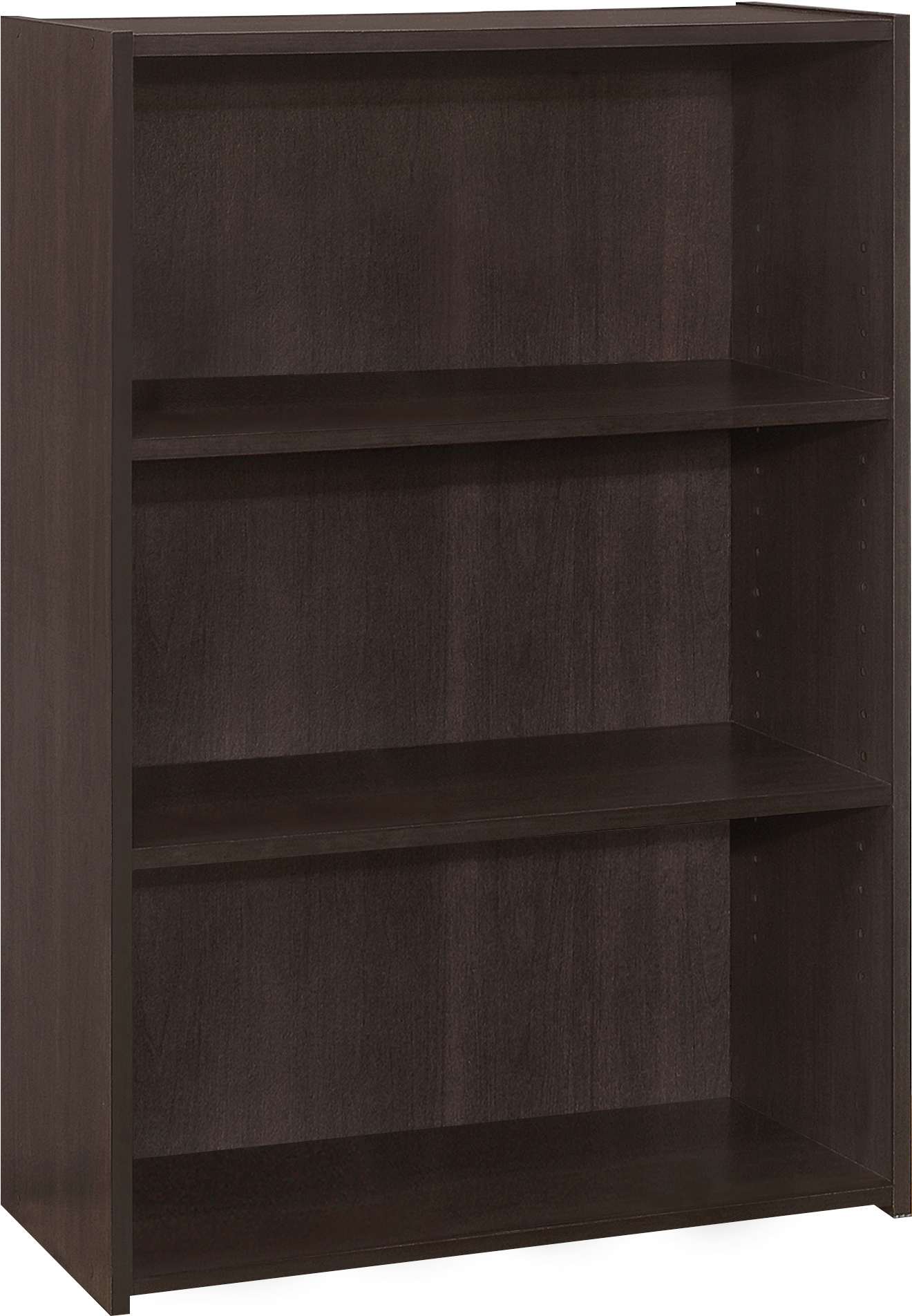 This 3-shelf bookcase in a simple, clean and space-saving design makes it a versatile storage option for any room in your home. The solid adjustable shelving allows for various sized objects to be displayed in your own creative way. Constructed from engineered materials in a warm cappuccino laminate finish, this transitional style bookcase could be used in an entryway to store all your shoes, or in a living room, home office, or bedroom to place books, toys, and decorative objects. Assembly is required.