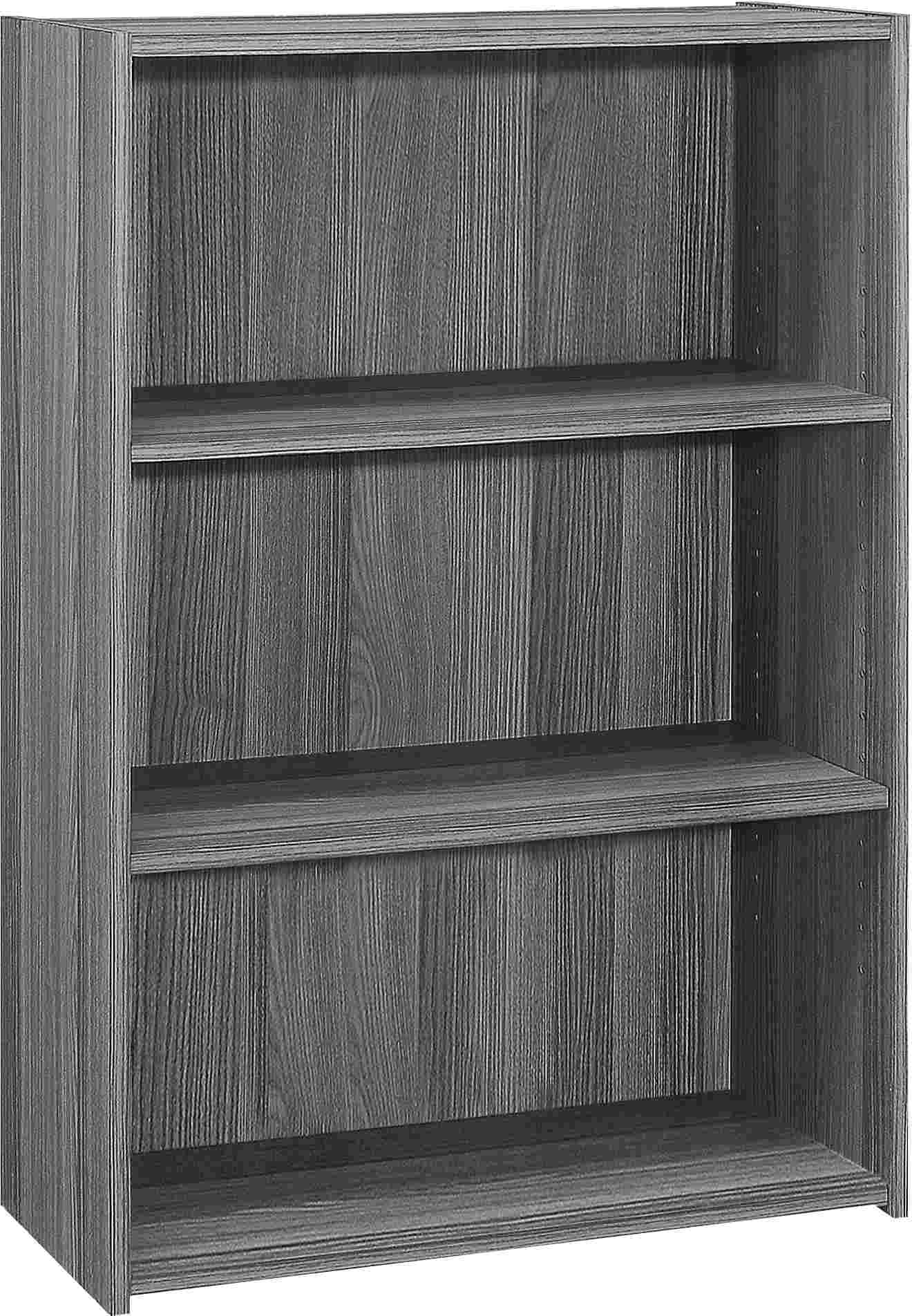 This 3-shelf bookcase in a simple, clean and space-saving design makes it a versatile storage option for any room in your home. The solid adjustable shelving allows for various sized objects to be displayed in your own creative way. Constructed from engineered materials in a sophisticated grey wood-look laminate finish, this transitional style bookcase could be used in an entryway to store all your shoes, or in a living room, home office, or bedroom to place books, toys, and decorative objects. Assembly is required.
