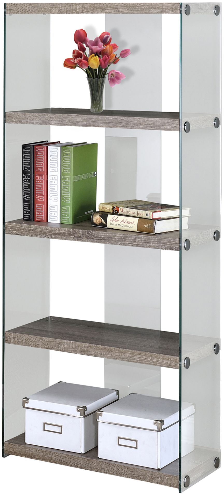 Spoil yourself with a chic tempered glass etagere that provides a perfect spot for candles, books, photo grams and other decor items. With four multi-functional, thick paneled display shelves in a taupe reclaimed-look finish, you'll be sure to add interest wherever you choose to place this accent display case. The five tier etagere is equipped with polished chrome accents for more elegance. Make this bookcase the new feature in your living space.