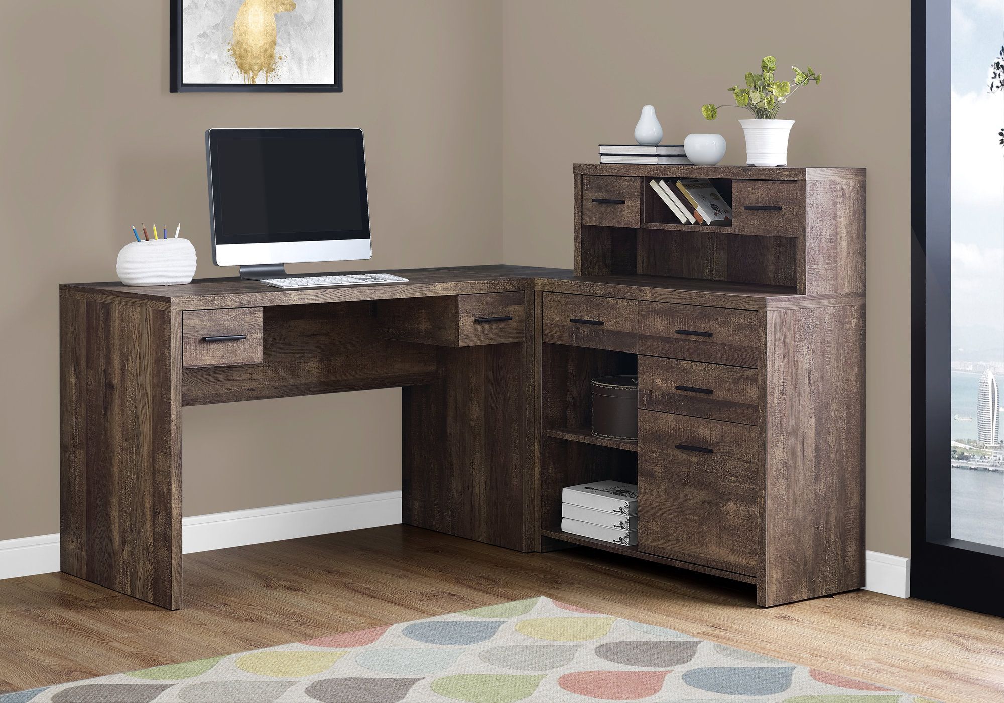 When spreading out important paperwork, or while working on your laptop, this stunning reclaimed wood look L shaped office desk in brown offers ample surface space for any task at hand. With two thick panel work surfaces, assemble this computer desk on both sides so that you can use it for a printer or other accessories, depending on the space in your small home, apartment or condo. This corner desk features an abundance of storage with a hutch, 3 open shelves (one adjustable), and several drawers for all sorts of documents including legal size. For added style, the desk includes accented black drawer handles.