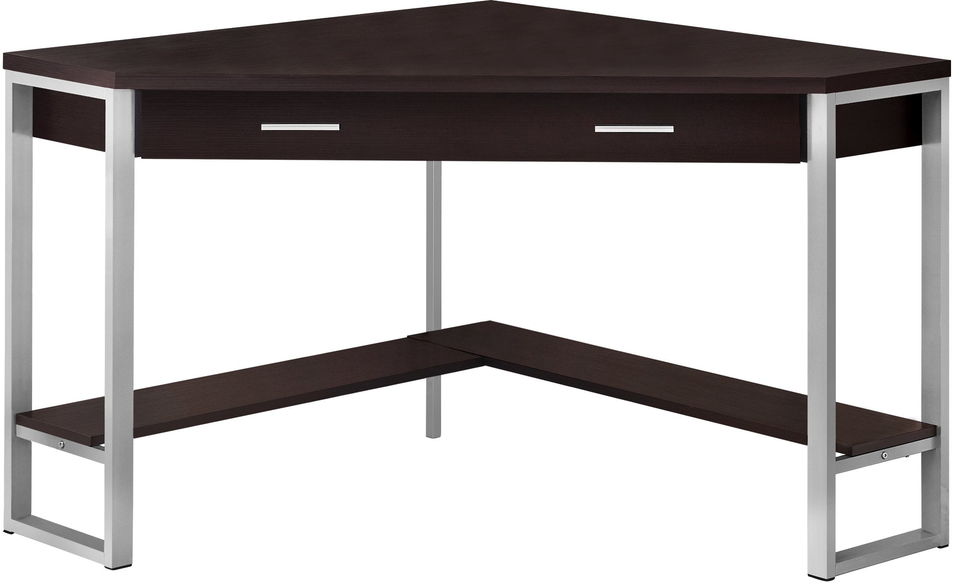 Making perfect use of valuable corner space in your small home, apartment or condo, this dark brown angular desk is there to help you have a positive workstation experience. Featuring a long drawer on smooth metal glides, the office desk also has a bottom shelf all around for extra storage space. The thick panel desktop is supported by a robust silver metal frame to ensure sturdiness. This computer desk has everything you need to complete or start a home office.