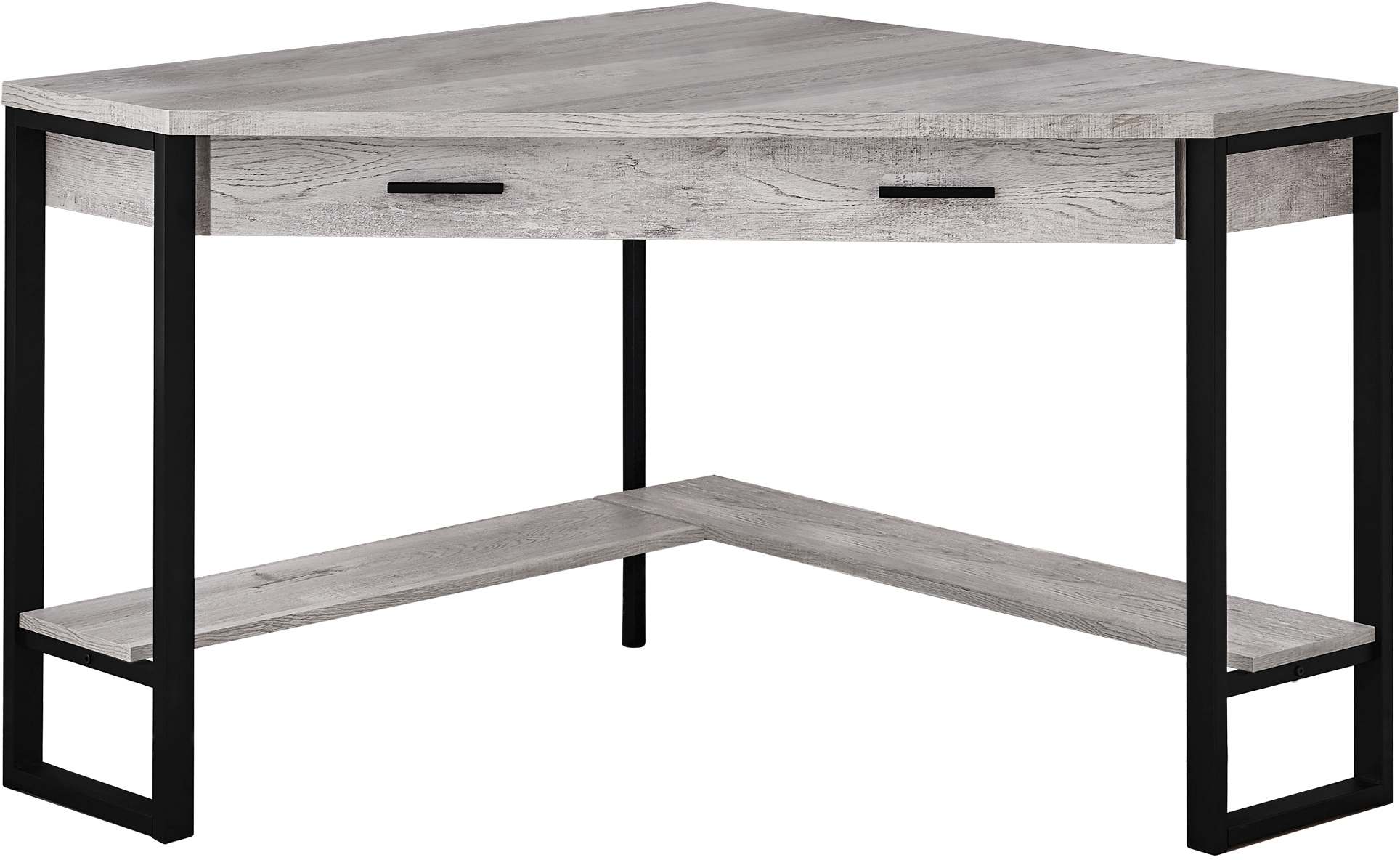 Making perfect use of valuable corner space in your small home, apartment or condo, this grey reclaimed wood look angular desk is there to help you have a positive workstation experience. Featuring a long drawer on smooth metal glides, the office desk also has a bottom shelf all around for extra storage space. The thick panel desktop is supported by a robust black metal frame to ensure sturdiness. This computer desk has everything you need to complete or start a home office.