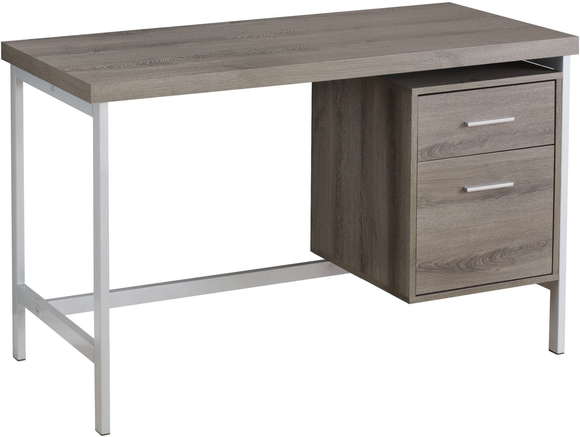 Sleek and contemporary, this desk finished in dark taupe on all sides is the perfect combination of function, durability and design in a modern form. With clean lines, a large, thick paneled surface and stylish silver metal legs, this piece will add pizzazz to any home office. Featuring a large storage drawer and a file drawer accented by silver colored drawer pulls to help keep your office supplies and documents organized and desktop clutter free. This desk provides plenty of room to meet your working needs without compromising style making this a must have in any home office.