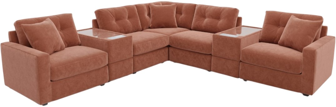Includes right arm chair, left arm chair, 2 electronic storage consoles, corner wedge and 2 armless chairs