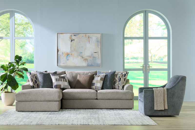 The Sonoma chofa offers both comfort and modern style for your home. Upholstered in a light grey fabric, it features plush, deep seating, perfect for lounging or entertaining guests. Accent pillows in shades of blue, brown, and modern geometric patterns provide a stylish contrast to the neutral tones of the sectional. The Sonoma is also available as a sofa for added versatility in smaller spaces.Read More