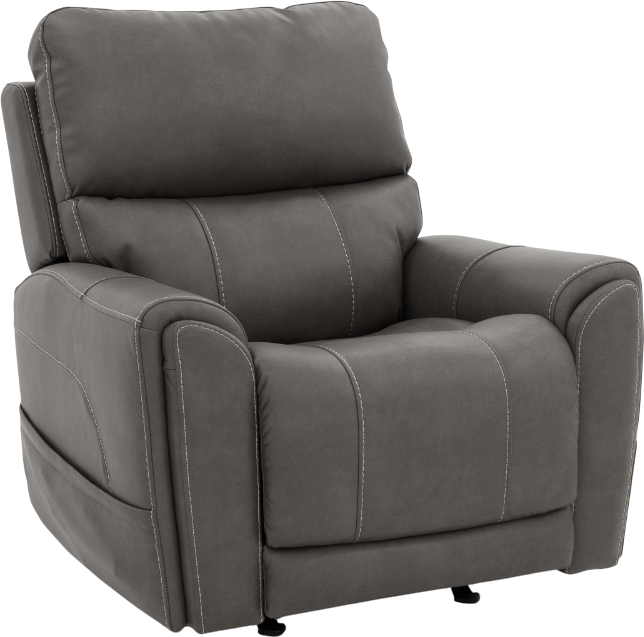 This recliner will be a statement in your home with its leather-like upholstery that is life-friendly for families. Flared arms, a contoured seat and heavy thread stitching details give it a sleek, yet striking look. And it all comes with pop-out cupholders in the arms for discreet storage.