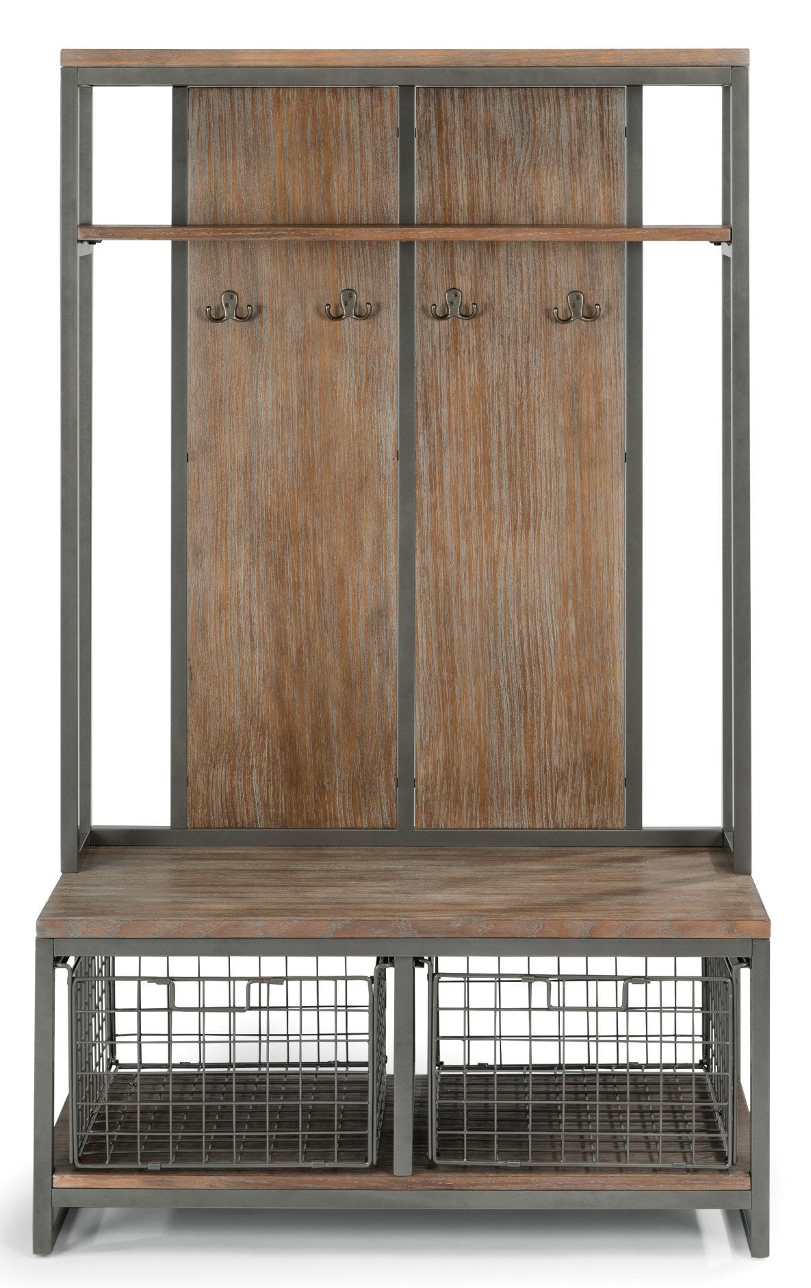 An alluring industrial design using mixed media materials gives this Telluride Hall Tree by homestyles a cool vibe. Constructed of wire-brushed pine veneer over engineered wood in a multi-toned driftwood finish with metal tube framing in a powder-coated, dark grey painted finish.Read More