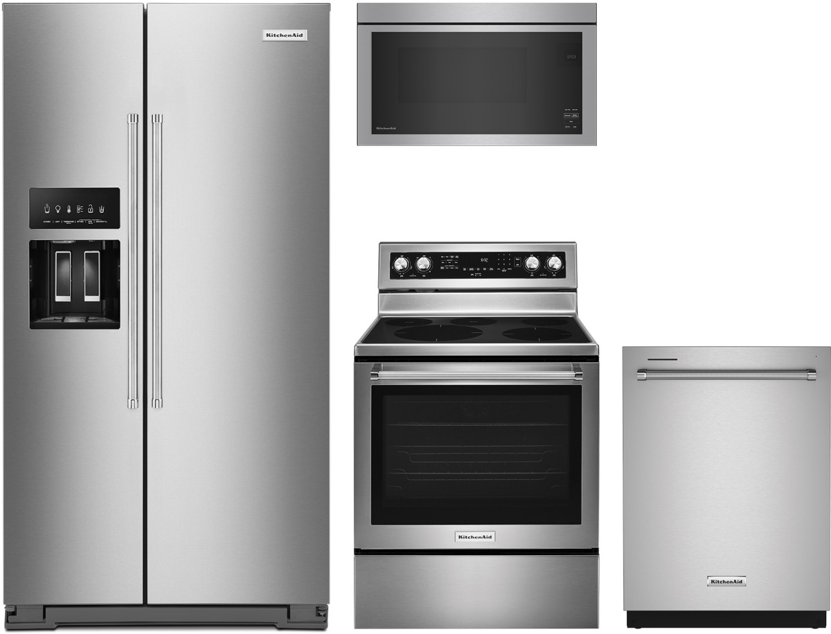 KitchenAid® 4 Piece Stainless Steel Kitchen Package with a side-by-side refrigerator, free standing electric range, over the range microwave and built in dishwasher.Read More