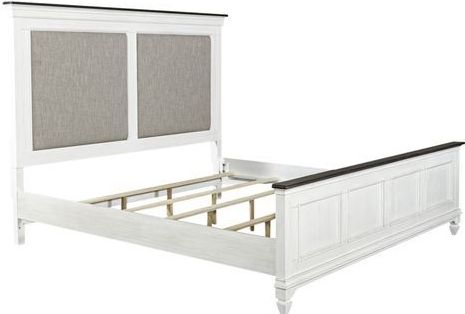 Create a classic look with a casual feel using the Allyson Park California king upholstered bed. The two-toned wire brushed white finish with charcoal tops creates a cottage style that works anywhere from the beach to the mountains. Crafted with pine solids and veneers with cathedral white oak tops, this piece features two panels upholstered in a beautiful grey linen, center slat support system, bolt on rails, bead molding and a charcoal gray cap rail.Read More