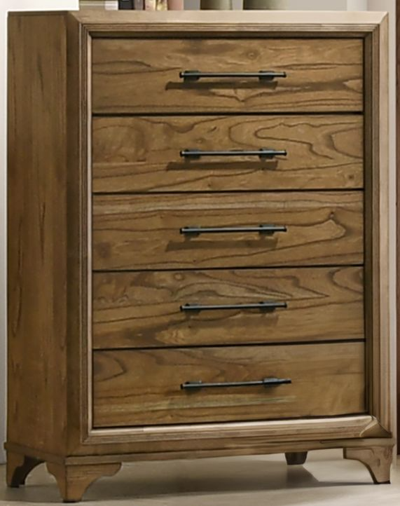 The Talcott 5 Drawer Chest in honey finish offers durability and style, crafted from solid Rubberwood, manufactured woods, and Mindy wood veneers for strength and stability. This transitional piece blends traditional and contemporary elements, featuring distinctive bracket feet, robust picture frame moldings, and sleek elongated drawer pulls.Read More