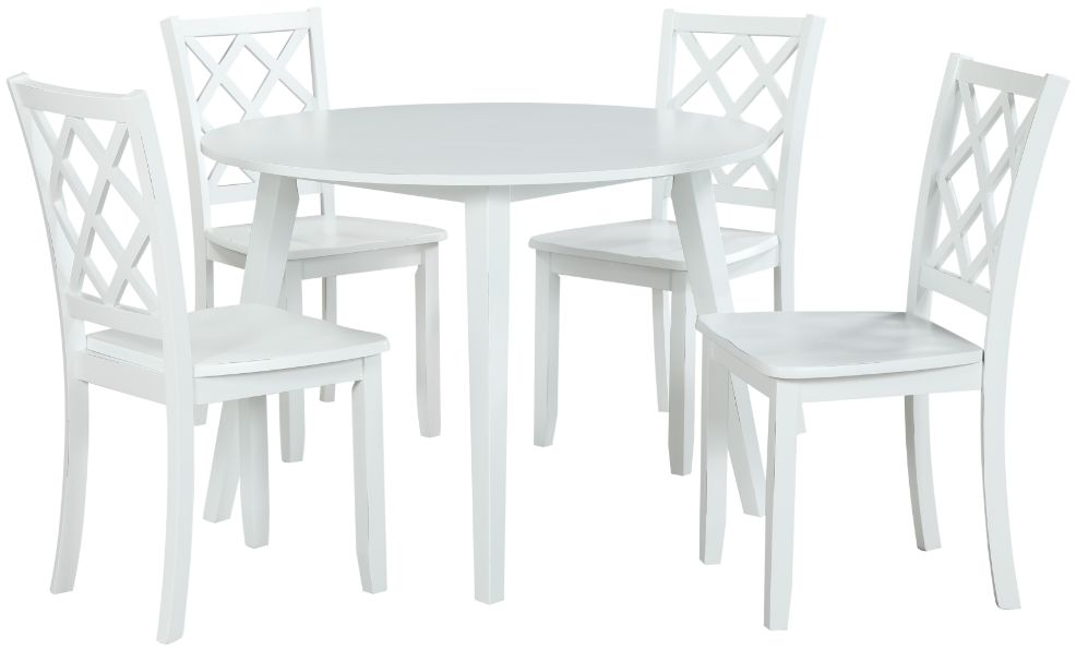 The Trellis 5 piece round dining set in white is an ideal addition to any cozy dining space, offering both style and practicality. This set includes one round dining table and four chairs, all meticulously crafted from solid rubberwood, manufactured wood, and birch veneers, ensuring durability and long-lasting quality.Read More