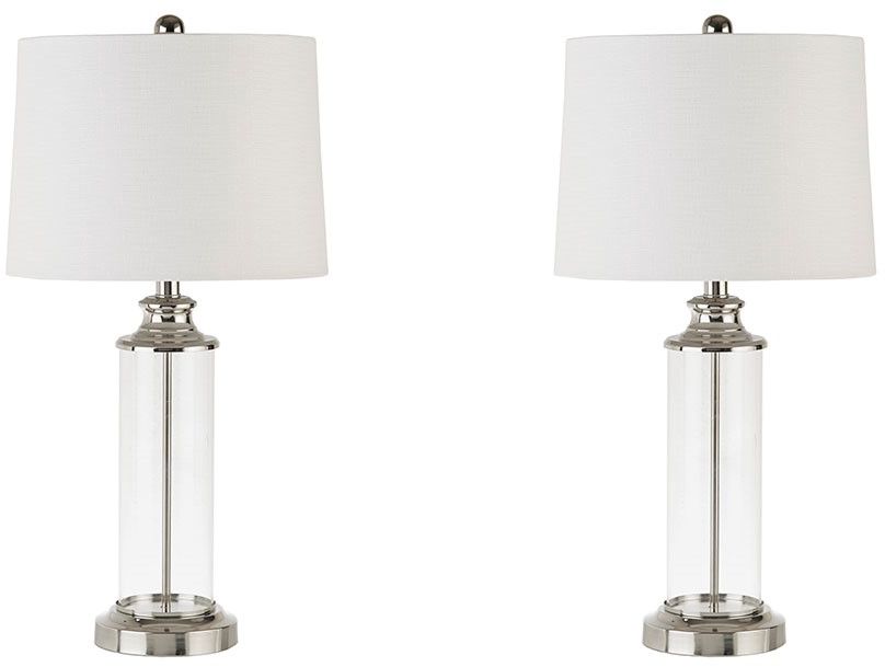 Update your living room or bedroom with the sleek style of the Clarity Table Lamp. The base is made from metal and glass with a silver nickel finish, for an elegant touch. A off white drum-shaped shade softly filters the light, while also beautifully complementing the striking look. Providing plenty of length a 72-inch clear cord and an on/off switch on the socket, this table lamp is easy to incorporate into your existing space and perfect for accenting any transitional home decor. One Type A light bulb is needed. Comes with a 2-year warranty.