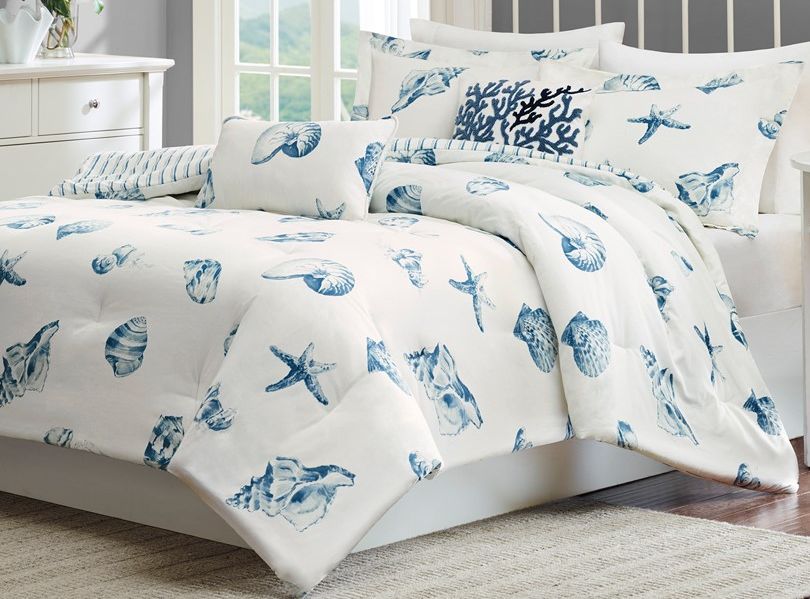 Bring a sense of the seaside into your home with this beautiful, casual Beach House bedding collection. The shell pattern is printed in shades of blue onto a white, cotton brushed twill. The duvet is fully reversible, reversing to a Yarn-Dyed stripe in blues and white. The duvet is oversized and machine washable for easy care. A duvet cover is a protective cover for your comforter, most likely for your down comforter.Read More