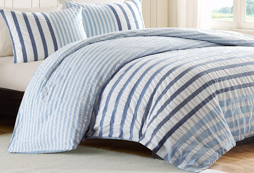 The Sutton Comforter Set shows off sublet stripes in dark, medium, and light blue amidst a white seersucker background. The different stripe widths along with the color variations add dimension to this clean look. The INK+IVY Collection offers a unique comforter finishing technique that offers a clean, duvet-like finish with no bar tacks on the top of the comforter. Made from yard dyed, 100% cotton, this set includes a comforter and two shams.