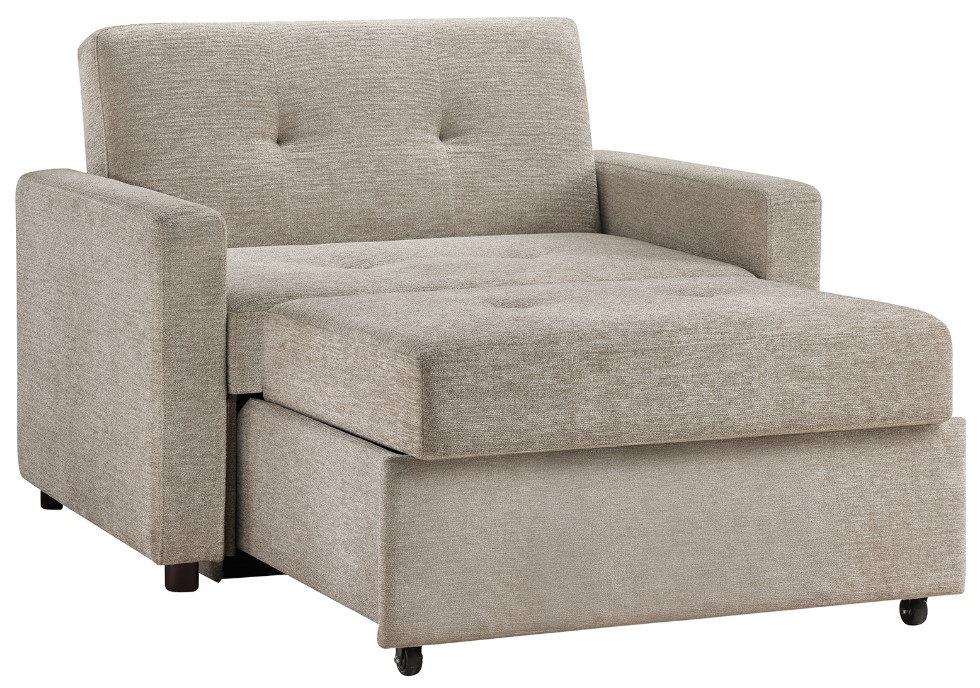 The chair features 7-inch welted box seat cushions and soft tan chenille fabric, providing both comfort and elegance. Easily extend it into a chaise, or drop the back to create a sleep surface perfect for naps or guests. The Noah Convertible Sleeper Chair adapts to your every need.