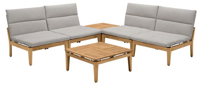 An The Arno Outdoor Seating Set outstanding feature of teak outdoor furniture has an outstanding feature of having the capacity to withstand all forms of weather. It is one of the few species of wood in the world containing natural oils that repel and wick away water, keeping it from splintering, warping, or becoming brittle. This set is modular, and you can really use your imagination when it comes to configuration! The chairs are armless and seamlessly fit together for a custom look. The chairs are armless and seamlessly fit together for a custom look. This 6-piece set comes complete with 4 Arno Teak Lounge Chairs and 2 Teak Coffee Tables. The Arno Outdoor 6 Piece Teak Wood Seating Set is available with Charcoal or Beige Olefin Upholstery.