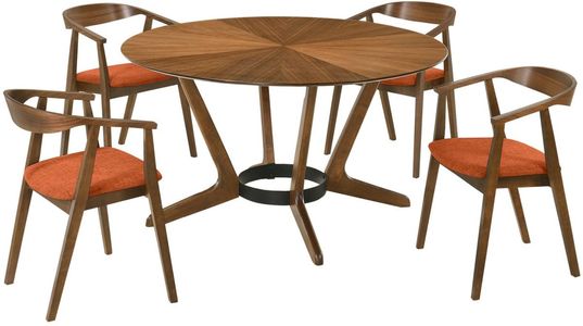 This dining set includes 1 dining table and 4 dining chairs. The round shape of our dining table makes it a natural hub for conversations and spending leisurely time. The 54” diameter tabletop easily allows seating for up to 6. The dining chairs feature a curved and hugging back to support you in just the right places. Completed with slender angular legs, the chairs make a stunning statement. The dining chairs deliver an airy silhouette vouching for hours of comfortable sitting. With an upholstered and padded seat, these dining chairs offer as much comfort as they do style. The Santana Dining Set is available in a walnut finish with your choice of charcoal, blue, or orange upholstery or a black finish with charcoal upholstery.