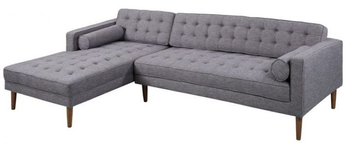 Ample room, living space worthy, in mid-century modern style revisited and just smoking cool is all the makings of our Armen Living Modern Element Sectional Chaise. This left-hand-facing sectional chaise, has all the room you'll need for seating in your modern loft, apartment or family home. It is a regal sectional that includes a chaise for stretch out on after a long day at work, or lounging or spirited discussions with your guests. Eye catchy button-tufting that makes it appealing on a Dark Gray linen fabric upholstery and straight and sleek walnut colored wood legs. It includes bolster pillows on each end of the sectional. The gentle sloping curves and large dual cushions create a favorite spot in your contemporary home. Pick your preference of a left-facing or right-facing chaise.