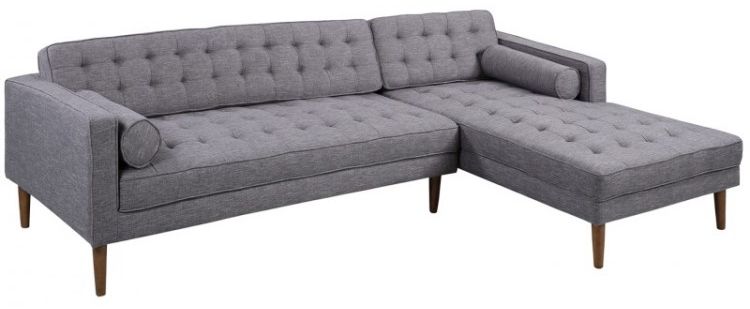 Ample room, living space worthy, in mid-century modern style revisited and just smoking cool is all the makings of our Armen Living Modern Element Sectional Chaise. This right-hand-facing sectional chaise, has all the room you'll need for seating in your modern loft, apartment or family home. It is a regal sectional that includes a chaise for stretch out on after a long day at work, or lounging or spirited discussions with your guests. Eye catchy button-tufting that makes it appealing on a Dark Gray linen fabric upholstery and straight and sleek walnut colored wood legs. It includes bolster pillows on each end of the sectional. The gentle sloping curves and large dual cushions create a favorite spot in your contemporary home. Pick your preference of a left-facing or right-facing chaise.