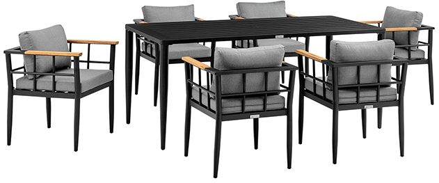 Enhance any outdoor space with the Ezra Outdoor 7-Piece Dining Set from Armen Living. This patio dining set includes 6 outdoor dining chairs and 1 rectangular patio dining table. The Ezra dining chairs feature a modern, clean line silhouette which is complimented further by the beautiful teak wood arm accents and the geometric barrel style back.Read More