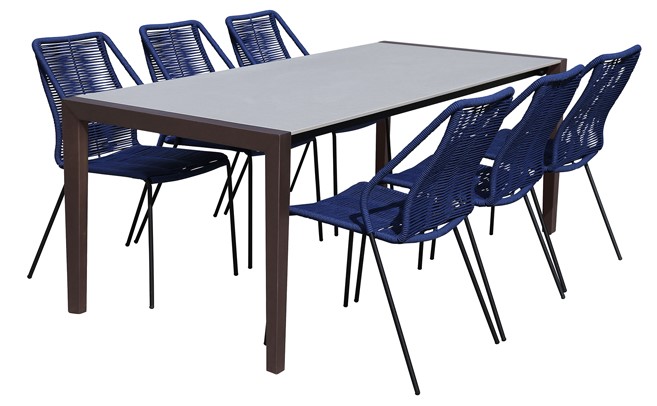 The Fineline and Clip Indoor Outdoor 7 Piece Dining Set in Dark Eucalyptus Wood with Super Stone and Blue Rope is a durable and fashionable addition to any indoor or outdoor space.Read More