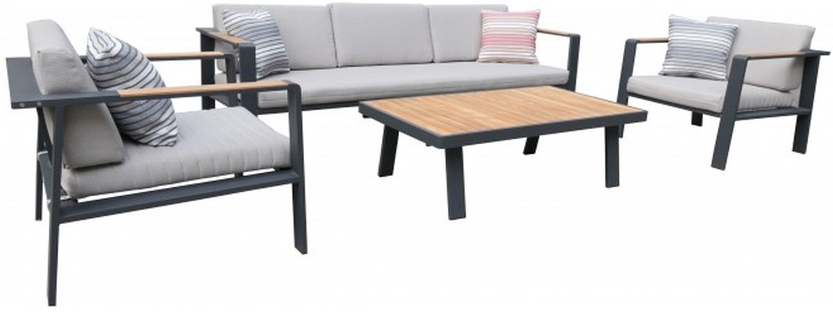 The Armen Living Nofi contemporary 4 piece patio set is an elegant ensemble of items that is certain to enhance the beauty of any modern outdoor seating arrangement. Featuring 2 arm chairs, 1 three-seater sofa, and 1 coffee table, the Nofi is an ideal arrangement for comfort and aesthetic balance. The beautiful Nofi coffee table features an aluminum frame complemented brilliantly by a sturdy teak wood top. The same teak wood is used to accent the arms of the sofa and arm chairs to enhance aesthetic cohesion. The olefin upholstered arm chair and sofa cushions feature foam padding and are water, chemical, and fade resistant. The Nofi set also comes with 4 throw pillows for added comfort and support. The lightweight Nofi outdoor patio set is available with your choice of charcoal finish with taupe cushions or gray powder coated finish with gray cushions.