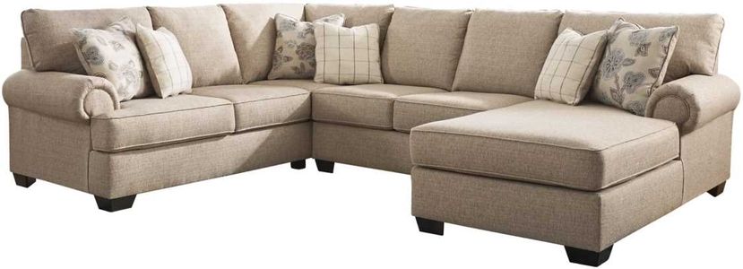 Lighten things up in a comfortably chic way with this sectional in "hemp" beige. Traditional elements such as t-cushion styling and prominent piping are modified with slanted roll arms for a beautiful balance of classic and contemporary. Linen-weave textural fabric is paired with posh designer pillows that truly perfect the look.Read More
