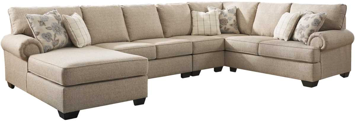 Lighten things up in a comfortably chic way with this sectional in "hemp" beige. Traditional elements such as t-cushion styling and prominent piping are modified with slanted roll arms for a beautiful balance of classic and contemporary. Linen-weave textural fabric is paired with posh designer pillows that truly perfect the look.Read More