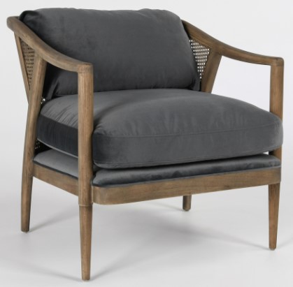 Tapered legs, rattan accent, and an angular frame give this chair a vintage charm that enhances any room. Plush polyester upholstery gleams in a stormy shade of gray while making this chair luxuriously comfortable. Also available in taupe.Read More