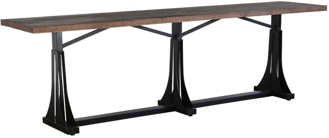 Elmira Gathering Table is made with a reclaimed pine top that has been hand finished to preserve the grains, knots, and other variations in the wood’s surface. A black iron base contrasts with the organic forms in the pine and completes the look of the piece. Seating for eight adds versatility.