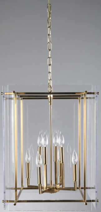 Sharp lines and a warm gold finish give this iron and acrylic chandelier a sleek look while eight bulbs perfectly illuminate any space.