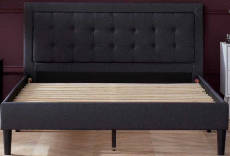 Our stylish bed frame features an upholstered, button-tufted headboard and metal frame with real wood slats in a timeless design. A chic foundation for your mattress—no box spring or additional frame needed.