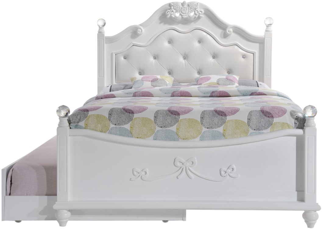The Alana Full Platform Bed with Storage Trundle is what little girl dreams are made of. The full bed offers a sense of wonder, featuring delicate bow moldings throughout, a button-tufted, white faux leather headboard, and sparkling crystal-ball posts.Read More