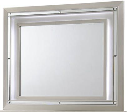 The glamorous Platinum storage bed is dressed in a fashionable champagne finish and adorned with a chic mirror trim. The upholstered headboard as well as the mirror feature mood lighting for a soft glow at the end of the day. Two convenient storage drawers are included in the footboard to help keep you stylishly organized. Embossed drawer fronts and crystal accents in the drawer pulls complete the look.