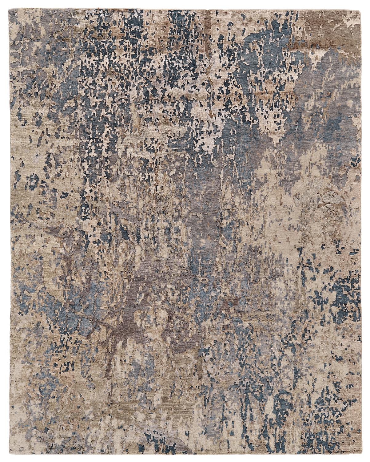 Layered contrasting hues create pieces of stunning textural interest in the Lor Collection. Hand-knotted in a wool and viscose pile each abstract design features pops of bold accent colors against serene backdrops of gray camel and silver.