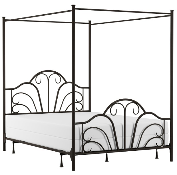 Elegant and whimsical Queen size Metal Canopy bed with scroll details offset by a simple canopy frame