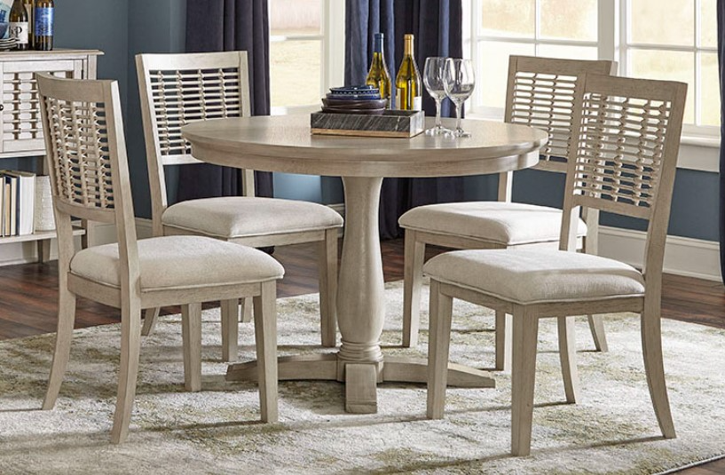 Breezy and graceful. The Hillsdale Furniture Ocala 5-Piece Dining Set includes one round pedestal table and four dining chairs all in a Sandy Gray wood finish. The chairs feature attractive rattan lattice backs and amply padded seats in an Ecru polyester upholstery with exquisite welt piping. Their contoured backs provide extra comfort.Read More