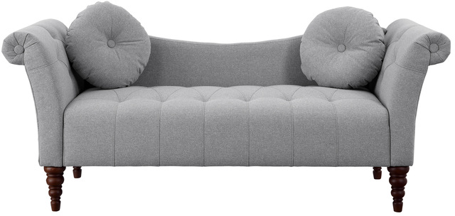 The elegant curves the Adira Collection create an air of sophisticated modern traditional styling perfect for your refined decorative preference. Timeless in style, the settee will be a wonderful addition to your boudoir or living room. Brown fabric covers the settee and features button tufting, dramatic rolled arms, two round button-tufted accent pillows, concave back panel, and espresso-finished turned wood legs.