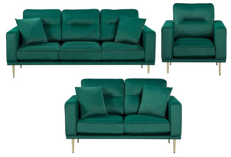 Green velvet fabric upholstery lends a soft touch to your seated experience, while reversible back cushions further the functionality of the collection.